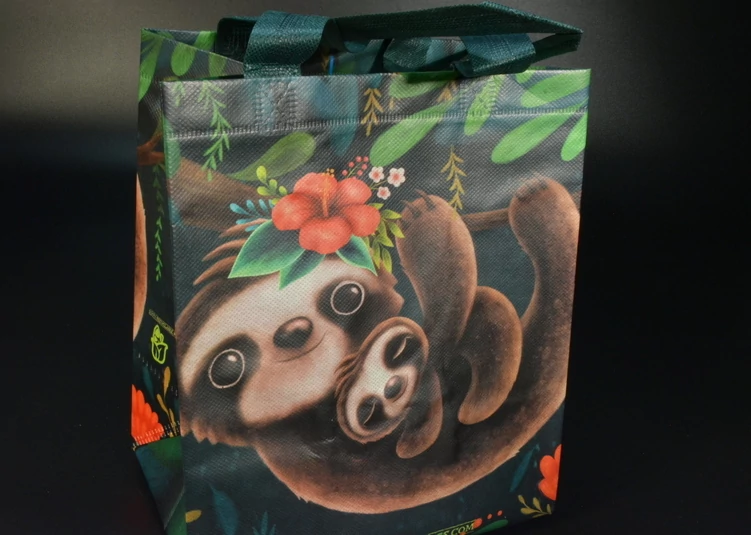 | Vidám lajhár mintás ökotáska 23x28x16 cm méretben, amely praktikus és környezetbarát megoldást kínál mindennapi bevásárláshoz és hordozáshoz. | |