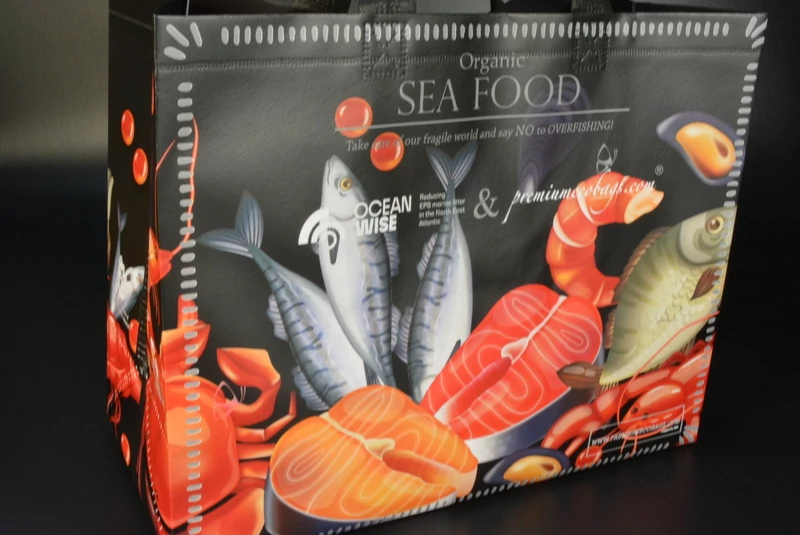 | Halak, rákok, tengeri herkentyűk mintás, újrahasznosított anyagból készült ökotáska, amely 10-12 kg teherbírásával ideális bevásárláshoz, strandoláshoz vagy mindennapi használatra. Praktikus méret, erős kivitel és környezettudatos választás egyben. | |