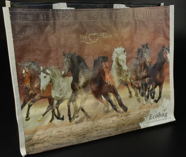 - Ökotáska, ami nem csak környezetbarát, hanem valóban használható is a mindennapokban. Ez a lovas mintás, mindkettő oldalán más lovakkal, újrahasznosított anyagból készült bevásárlótáska egyszerre praktikus, strapabíró és stílusos megoldás minden helyzetre, ahol pakolni kell.