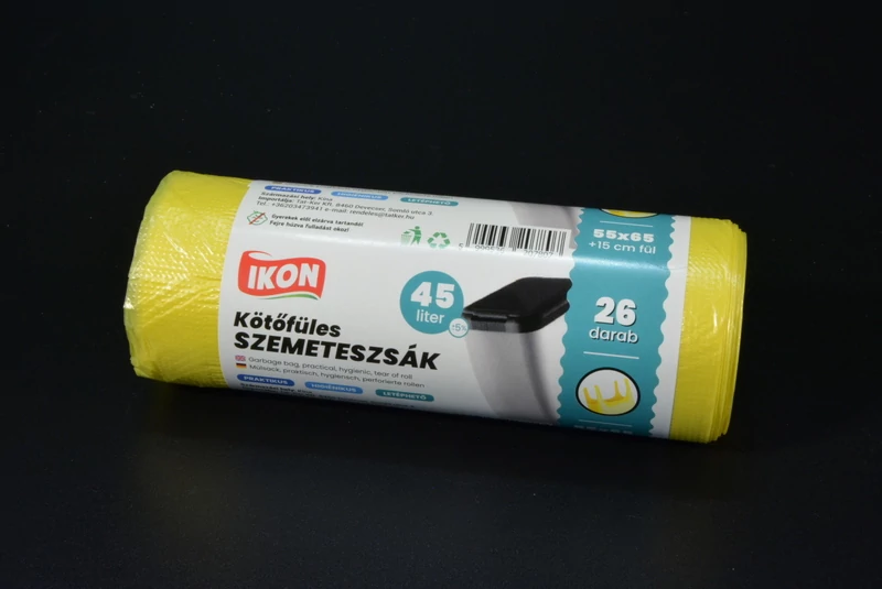 | 45 literes kötőfüles szemetes zsák, 26 db-os kiszerelésben – praktikus, erős és higiénikus megoldás közepes méretű kukákhoz otthon és irodában. | |